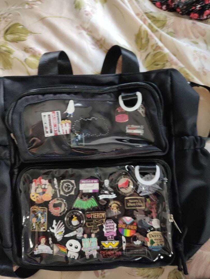 Show off your favorite pins, keychains, and plushies with our classic black itabag! Designed for anime lovers and collectors, this backpack features a spacious clear front window and a removable insert board to safely display your fandom essentials — without worrying about damaging the bag.