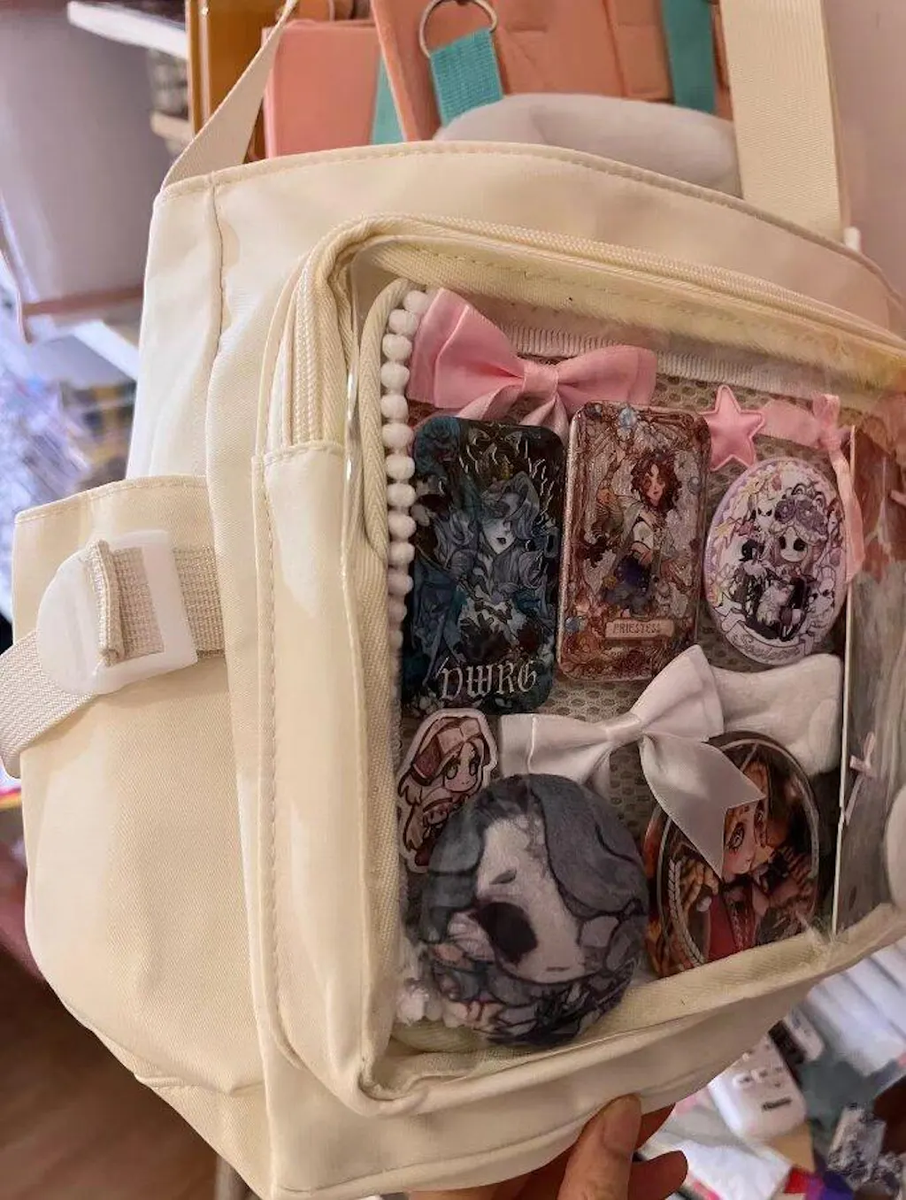 This is the ita bag for people who have a lot to display and actually need to carry things at the same time. The front display window is 25cm × 19cm — large enough to fit multiple 10cm plushies, a full spread of photocards, or a dense pin arrangement. The side buckle pockets are specifically sized to hold a 10cm doll each. And the main compartment takes A4 books, B5 notebooks, and an iPad together without issue. This is a bag you can take to a convention, a fan meet, or class, and have everything with you.